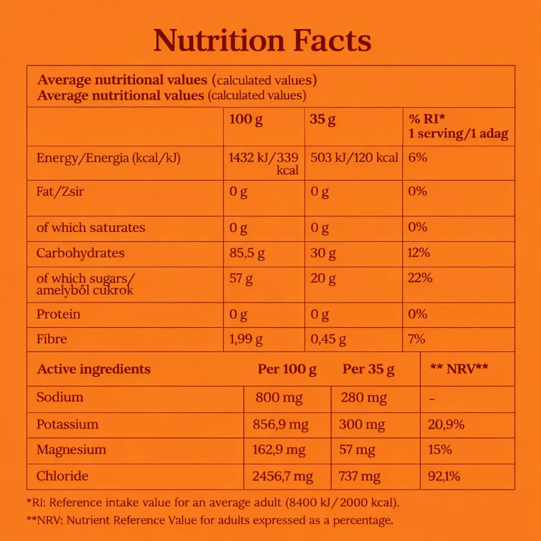 Az izotóniás szénhidrátkoncentráció segíti a gyors folyadékfelszívódást, miközben azonnal használható energiát biztosít.